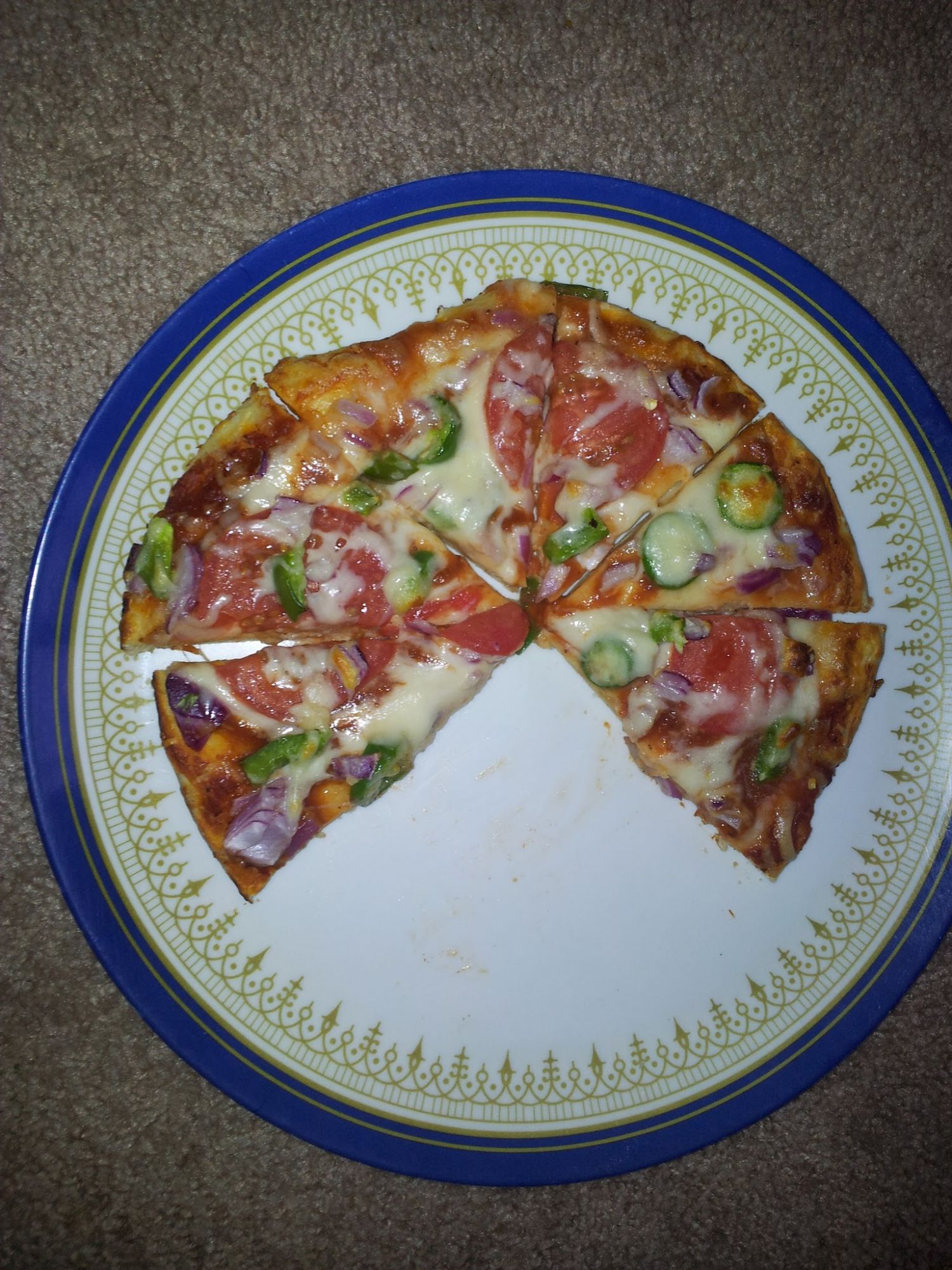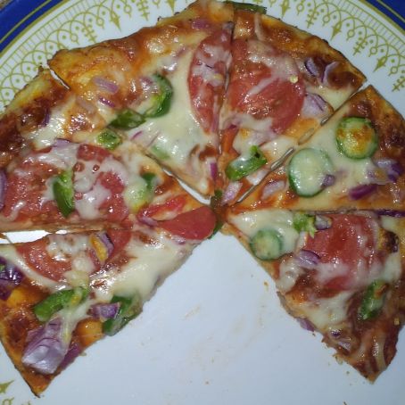 1/2 tomato, 1/4 capsicum, 1 mushroom and 1 jalapeno. some more toppings like chicken , pineapple can also be added.
