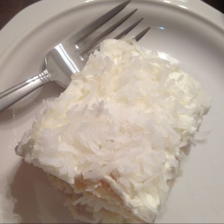 Mix cream of coconut and sweetened condensed milk together. Pour over the top of the still hot cake. Let cake cool completely then frost with the whipped topping and top with the flaked coconut. Keep cake refrigerated.