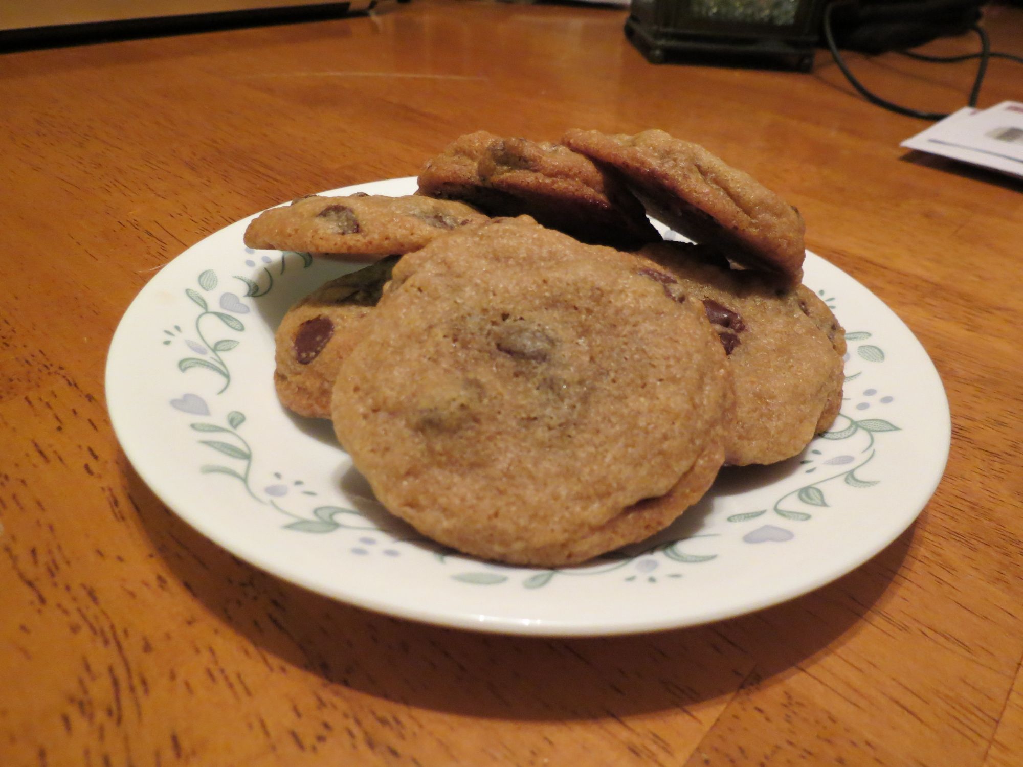 Cream together butter, sugar and brown sugar. Then beat in eggs and vanilla.