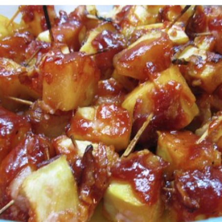 Wrap each pineapple chunk with a piece of bacon, securing with a wooden pick.