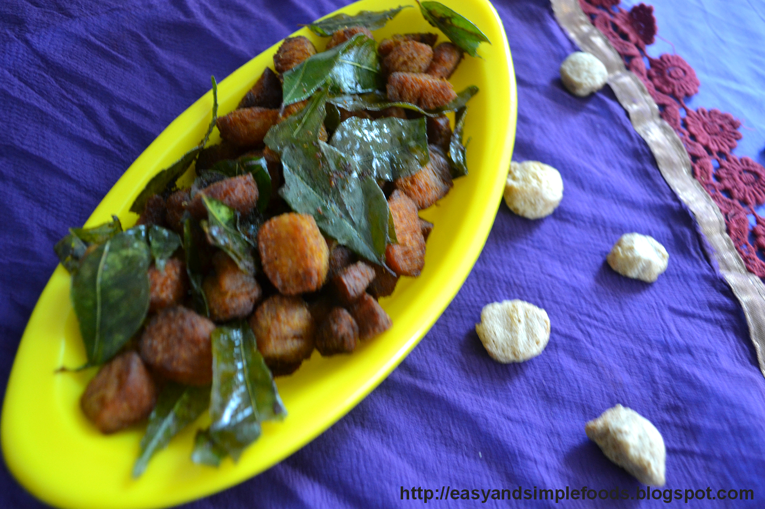 Heat oil in a pan or kadai, add curry leaves and the marinated chunks, fry untill they become golden brown and crispy.