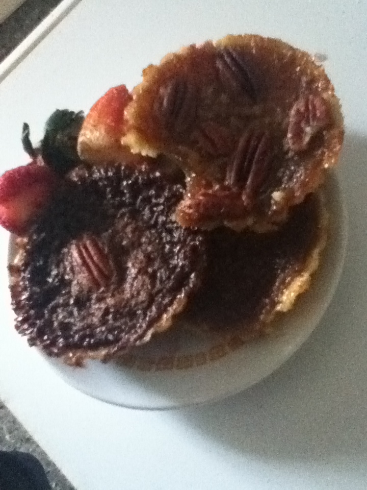 Keep a tray underneath the tarts to catch any filling while baking. Though its very yummy sometimes the cracked appearance can be unsightly even with pecans. You can use chocolate mouse for the chocolate tarts or powdered sugar and crumble for all of them. Enjoy!