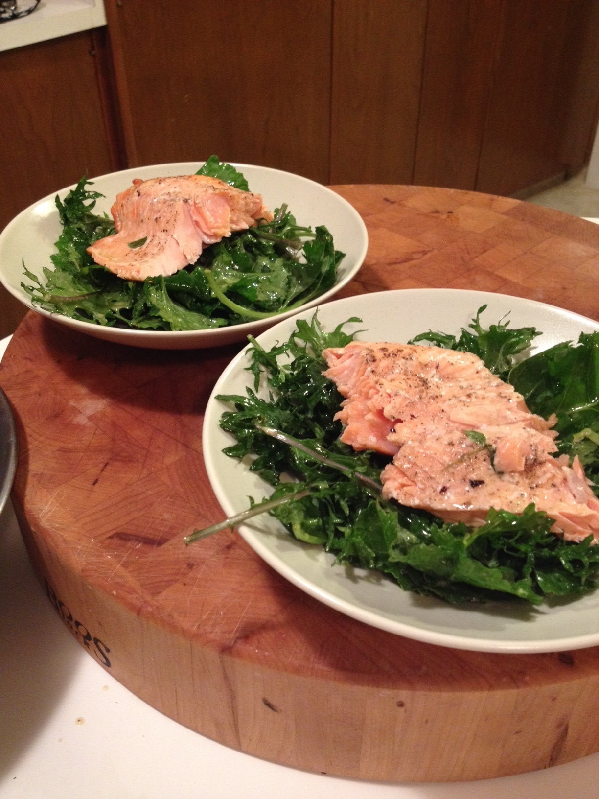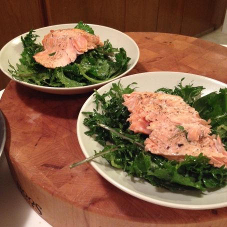 Cut asparagus in 2-inch pieces. Toss baby kale and asparagus with remaining dressing to taste. Arrange kale in shallow serving bowls. Top with salmon. Garnish with pine nuts if desired.