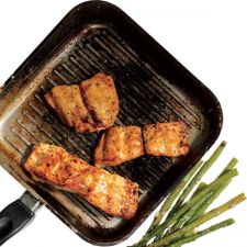 Meanwhile, heat remaining oil in an ovenproof skillet over high heat. Season salmon fillets with salt and pepper, then add to the pan, flesh side down. Cook until browned on one side, 3 to 4 minutes. Flip the fillets, brush on half the honey mustard, and place the pan in the oven. Bake until fish is firm and flakes easily (but before white solids begin to form on the surface), about 5 minutes. Remove fillets from the oven and brush with more honey mustard. Serve with asparagus.