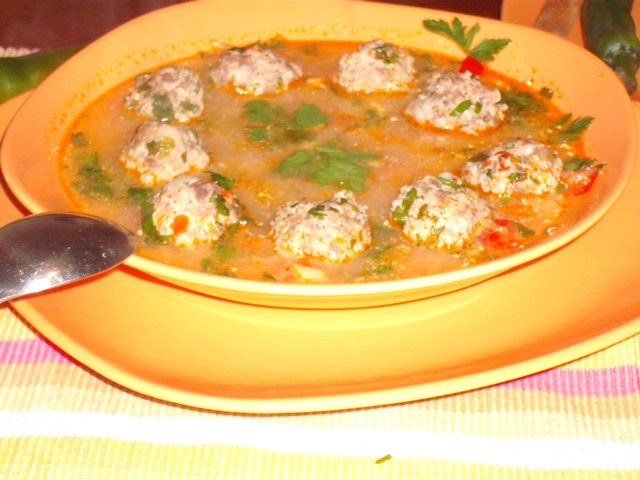 Bring the ciorb to a simmer and add the meatballs and the beef stock.