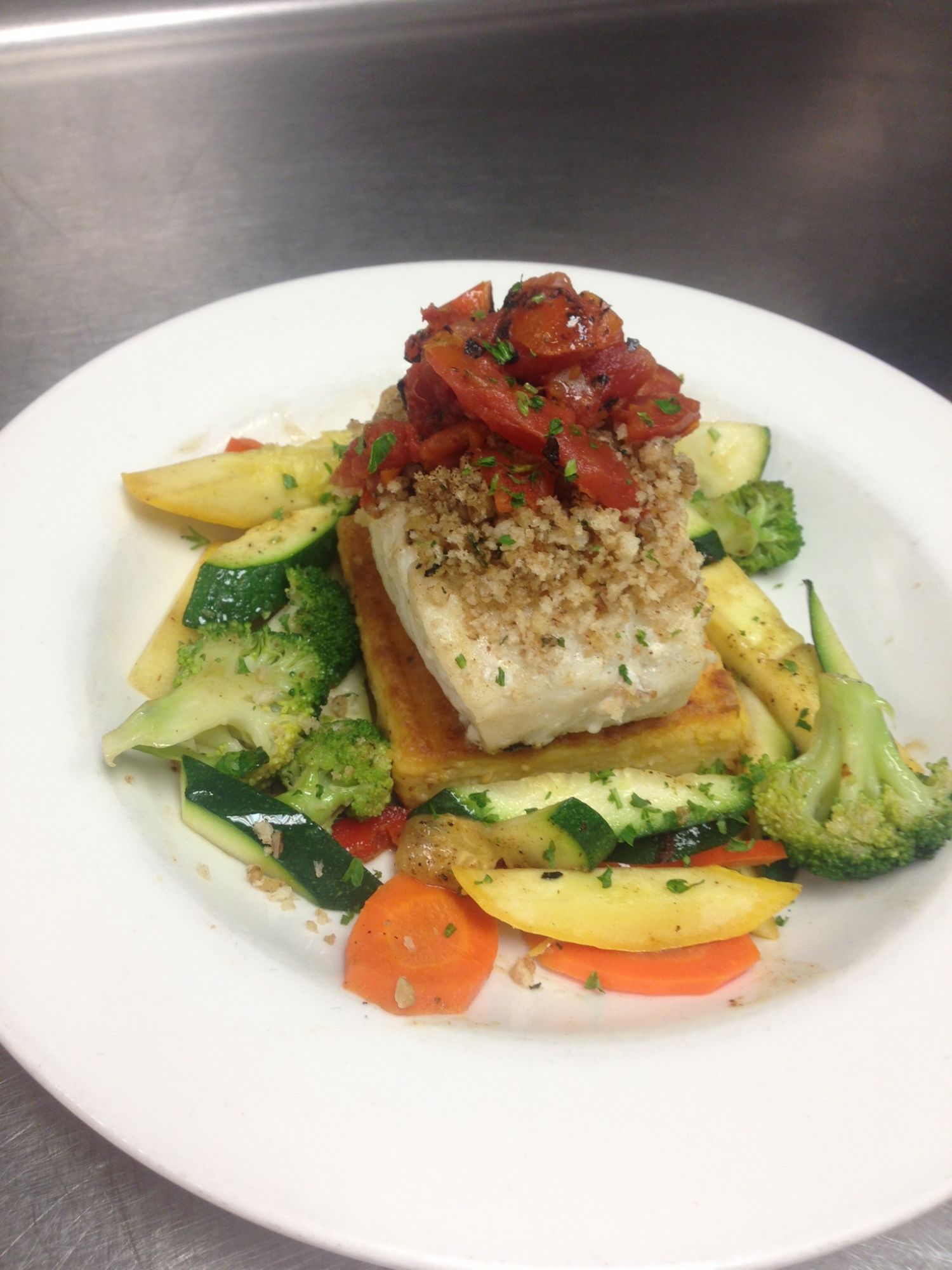 pan seared and baked with a pecan crust and fire roasted tomatoes served with a grit cake and vegetable medley.