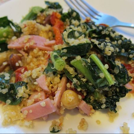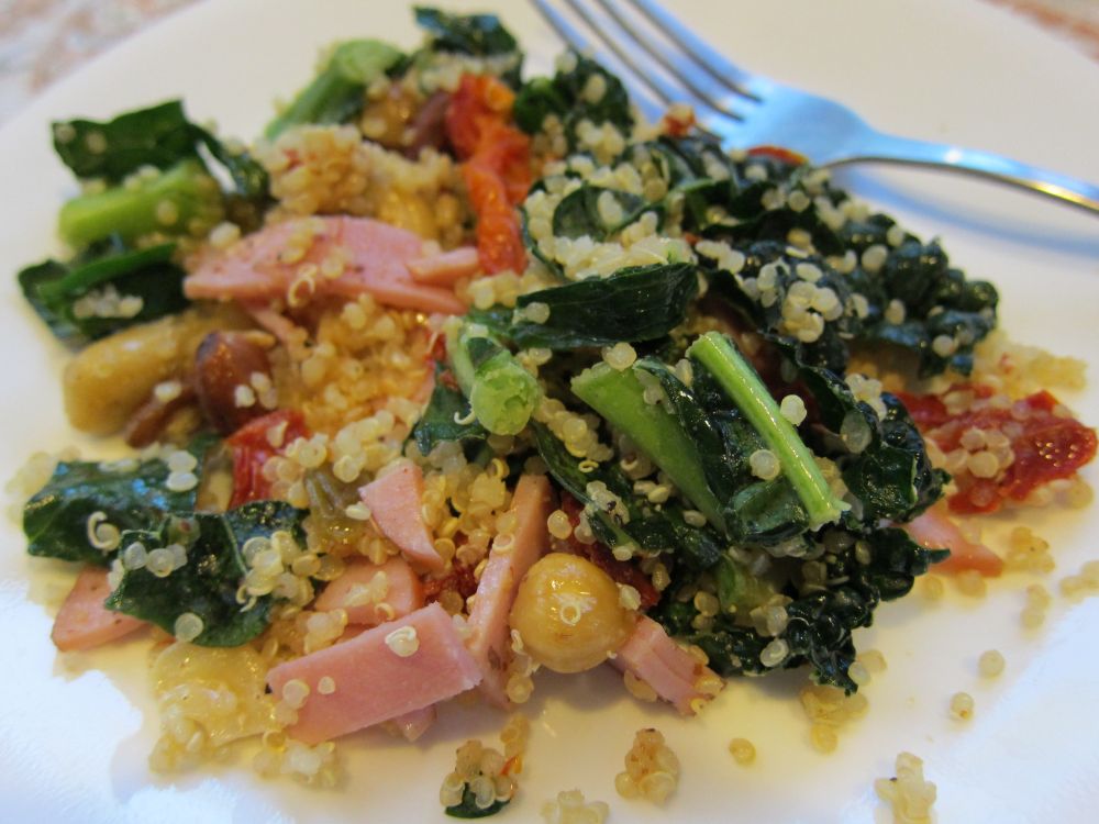 chop the kale, mix with sun dried tomato, nuts, raisins, diced ham