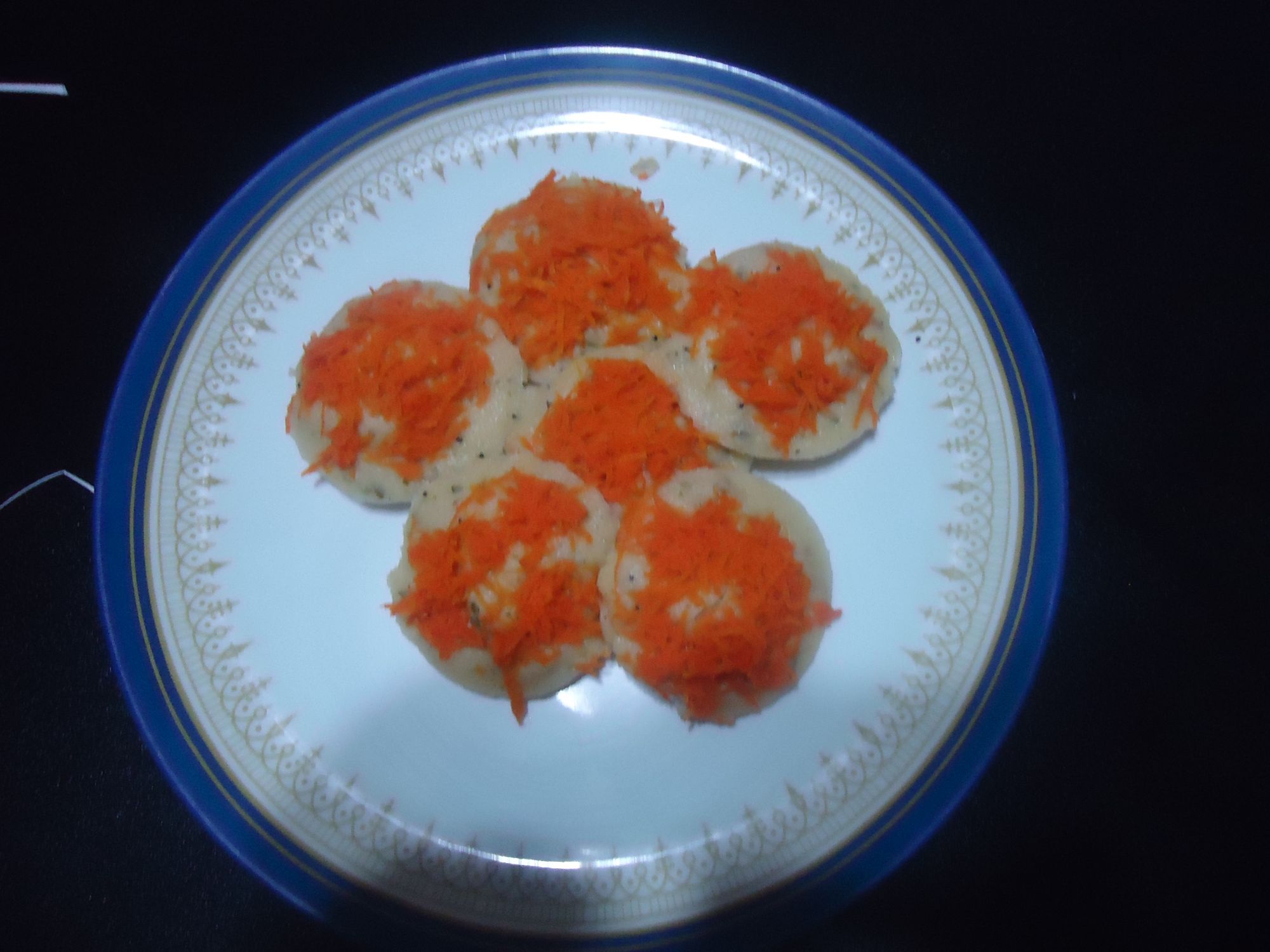 Shred the carrot over the idli plates.