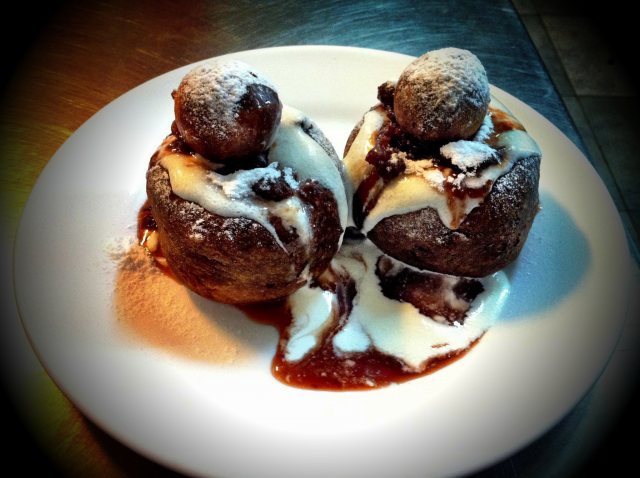To assemble the papanasi: put the large ball on a plate, fill the hoe with preserve(dulceata) and a sour cream – be generous – then add the small ball on the top. Dust with some icing sugar. Serve immediately.