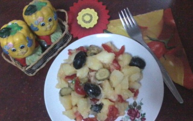 Se amesteca toate ingredientele,se adauga maslinele si....Pofta buna! :)