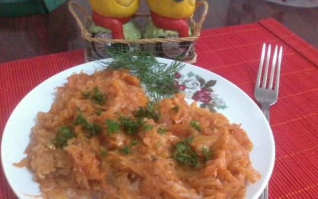 Se adauga varza si se amesteca din cand in cand pana se inmoaie. Se adauga pasta de bulion sau suc de rosii si se mai lasa pana cand varza este calita.