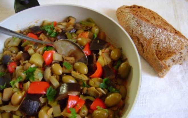 Incingem uleiul de masline intr-o tigaie mare cu baza grea si stabila si punem in ea bucatile de vanata,ceapa,telina si ardeiul cu putina sare si piper.