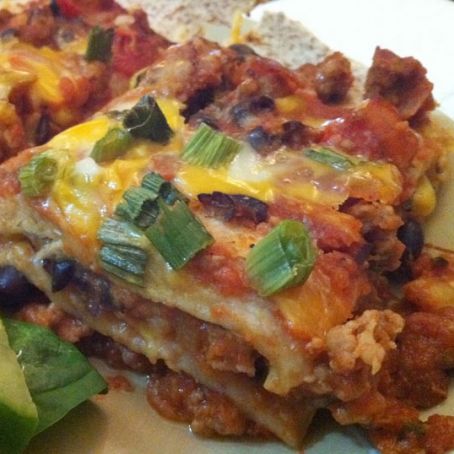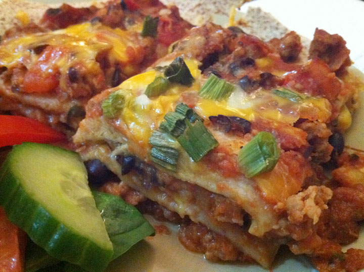 To assemble lasagna, spread sauce mixture over bottom of casserole dish. Top with 1/2 the tortillas, overlapping and cutting them as necessary to fit. Top with 1/3 sauce mixture, followed by half of the cheese. Cover cheese with remaining tortillas, followed by remaining sauce. Sprinkle remaining cheese over sauce and top with green onions.