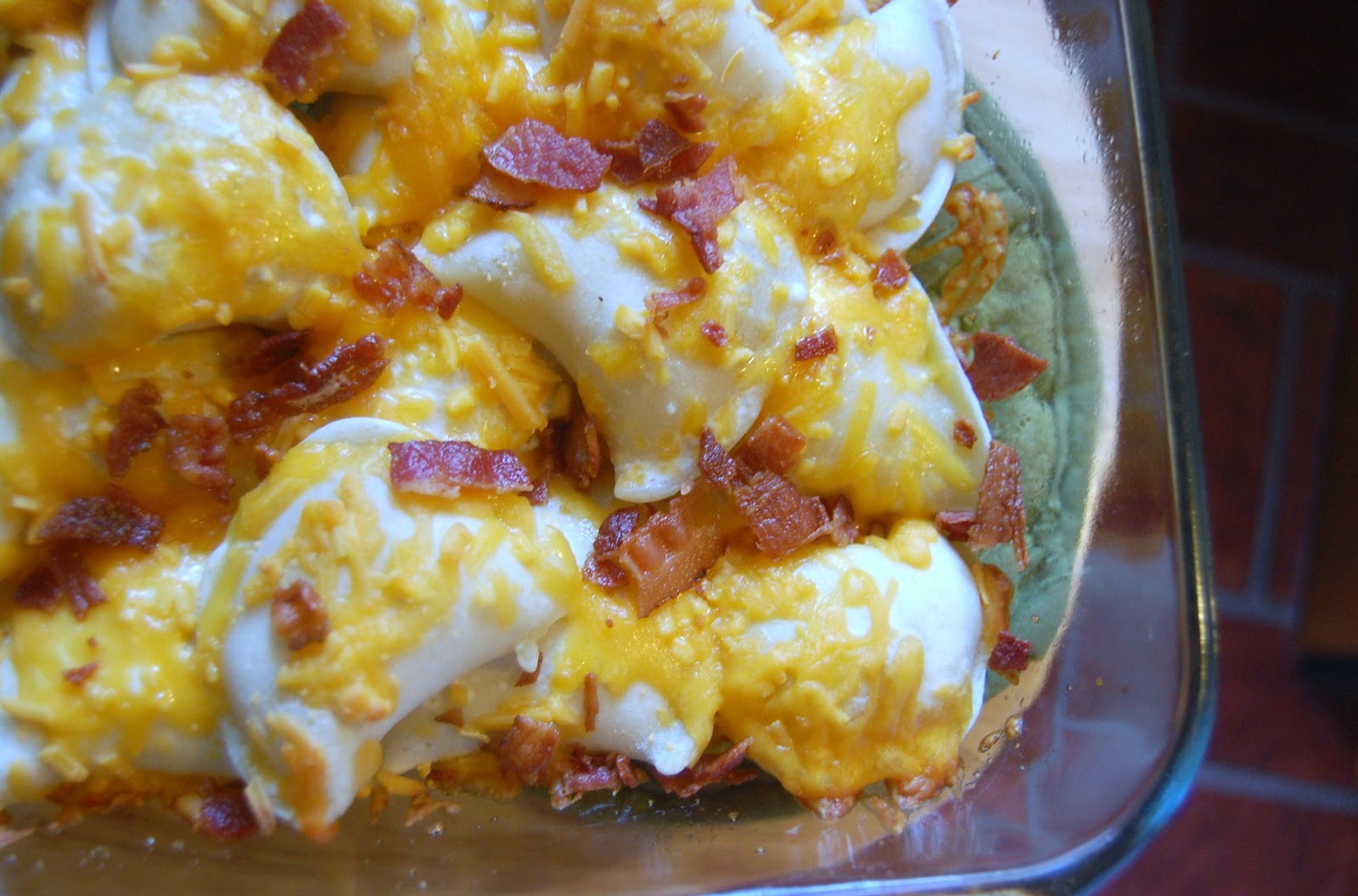 In a medium sized casserole dish, combine perogies, broccoli, and ham.