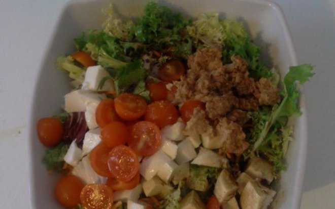 Am pus toate ingredientele intr-un bol,am condimentat cu sare,otet balsamic si ulei de masline si am mestecat.