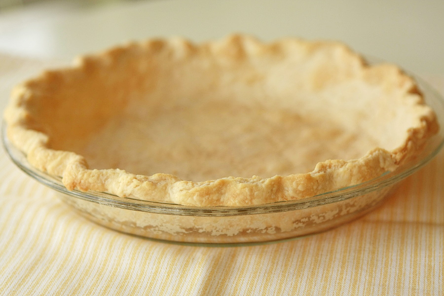 Mix together the bisquick, butter and boiling water. Spread in pie pan with hands and bake at 400 degrees for 8 minutes.