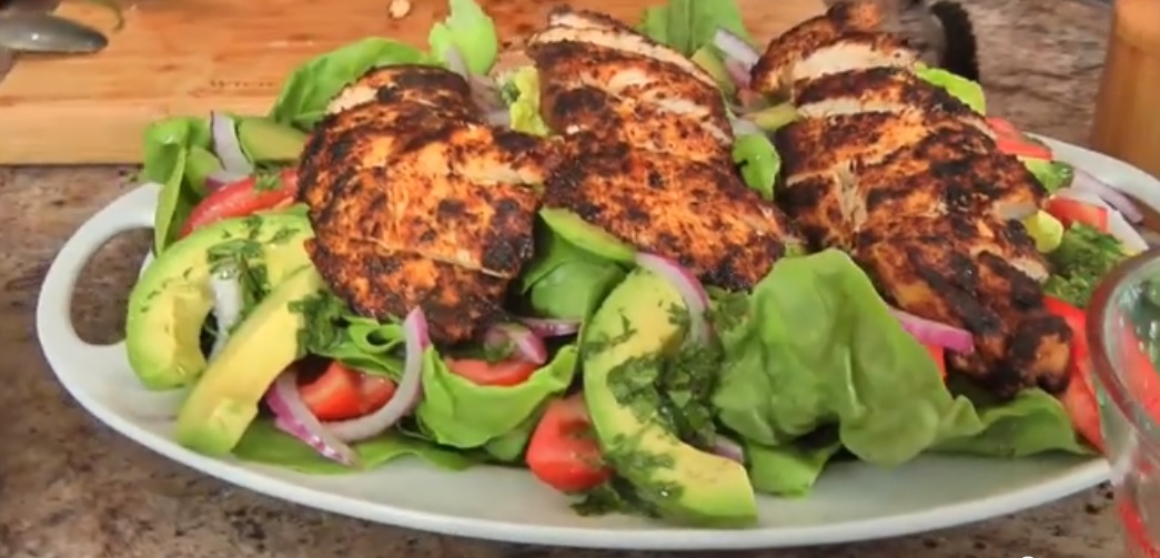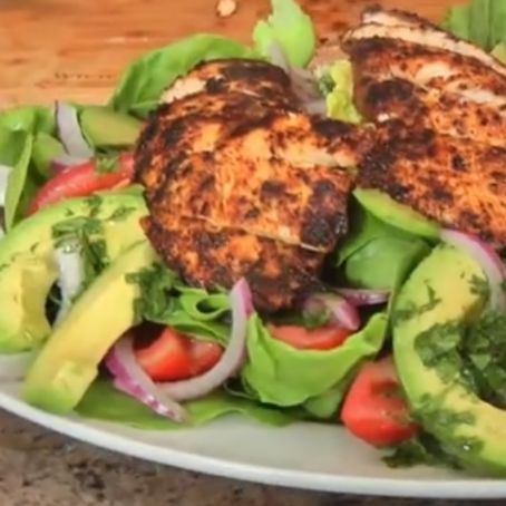 5) Arrange the tomatoes, onion and avocado on top of the bed of lettuce, season slightly with salt and pepper and set aside.