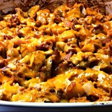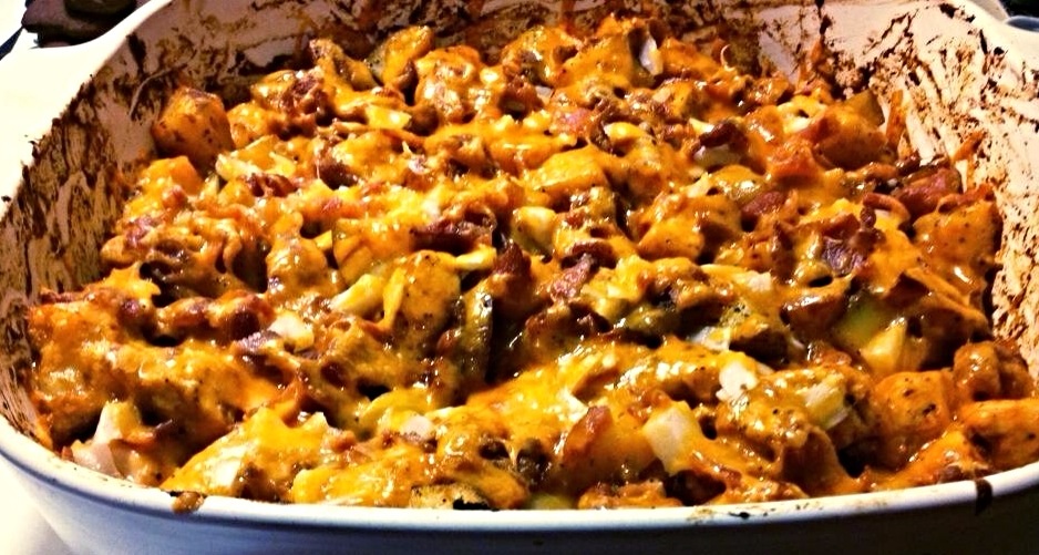 Sprinkle onion and bacon over potato/chicken mixture. Top with cheese.