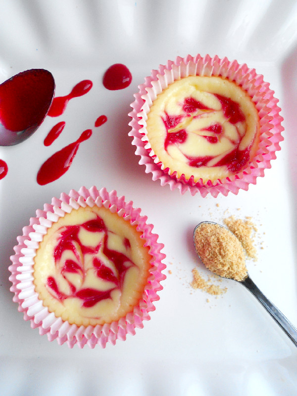 To assemble, spoon 3 tablespoons of the cheesecake batter over the crust in each cupcake liner. Dot a ½ teaspoon of the raspberry puree in a few dots over the cheesecake filling. Use a toothpick or a wooden skewer to lightly swirl and create a marbled effect.