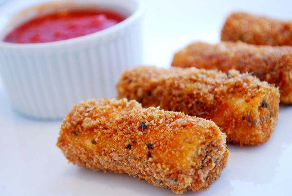 Place each completed mozzarella stick onto a baking dish. Bake for 10-15 minutes, until mozzarella sticks are a golden color. Serve with marinara sauce or dip of choice.