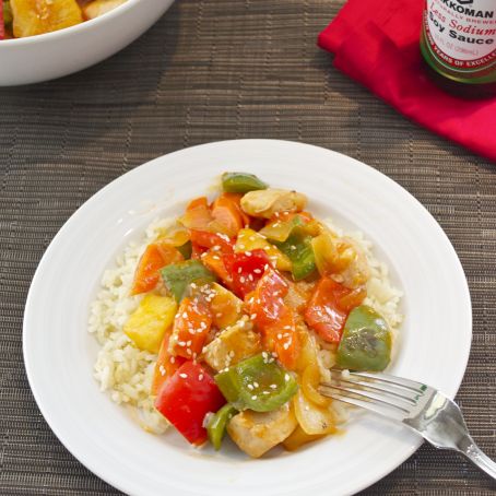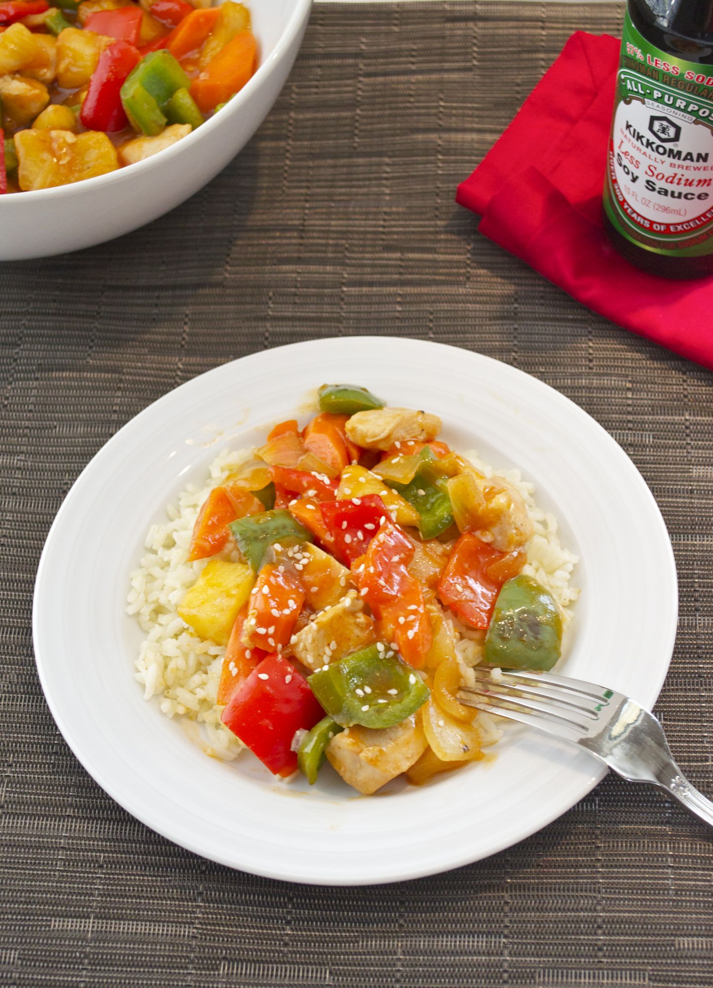 Add ketchup, sriracha, vinegar, brown sugar, oyster sauce and white pepper to pan, and whisk to combine. In a separate bowl, whisk together the fruit juice and cornstarch until it has dissolved. Then add the mixture to the sauce. Bring to a boil, then reduce heat to medium-low. Add back in the vegetables and chicken, and the pineapple, then stir until evenly coated.