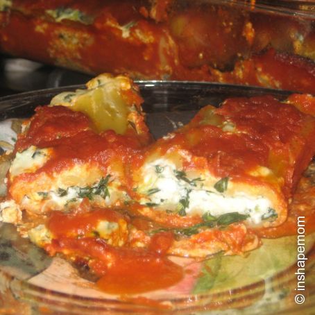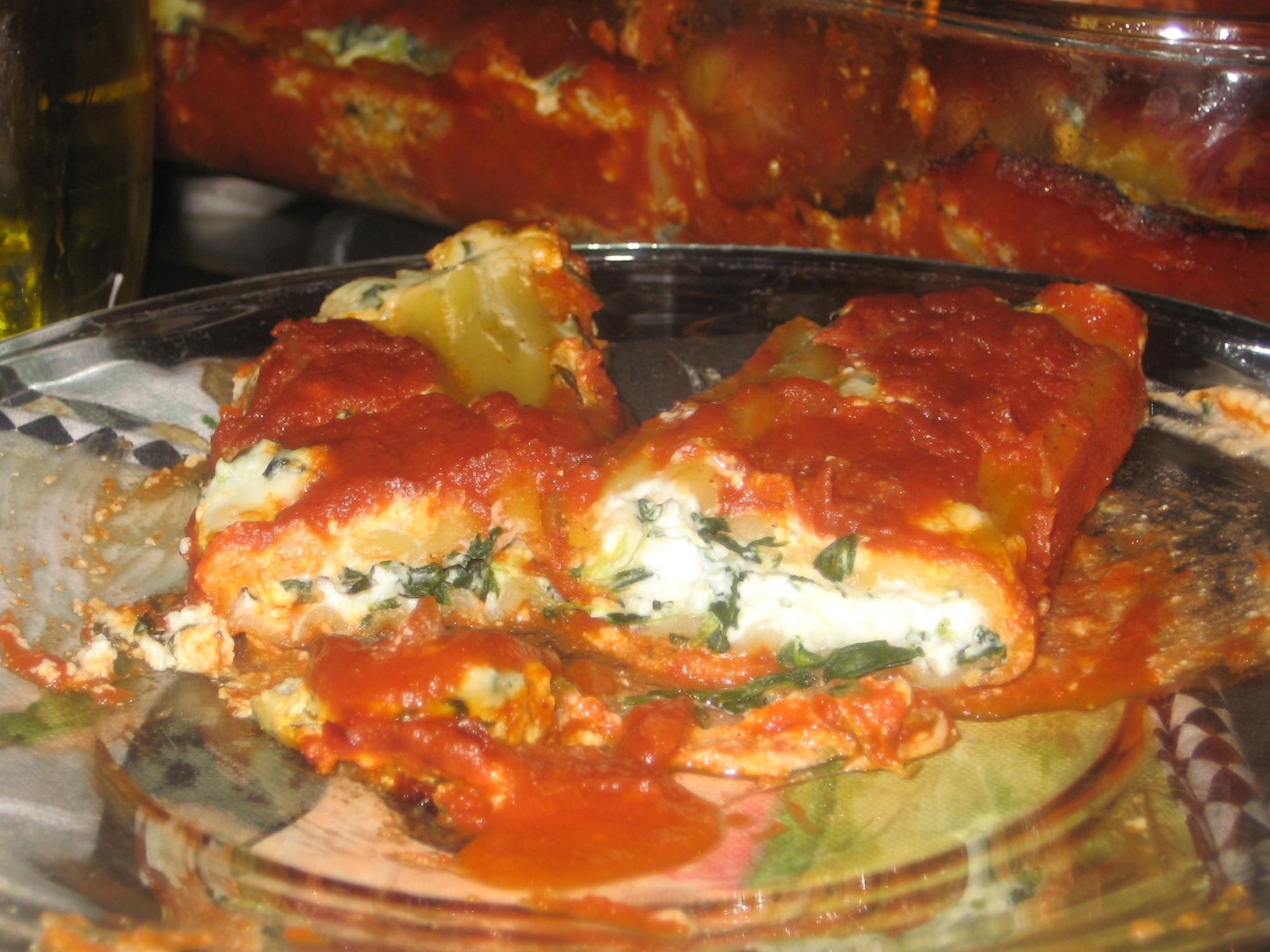 Now take one manicotti shell and fill gently with your hands, or use a piping bag. Lay shell on baking sheet, fill remaining shells. Now evenly pour marinara sauce over all shells.