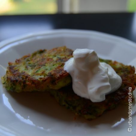 In a large skillet over medium high heat, add 3 Tbsp. olive oil. Take a small little drop of dough and place in the oil. Watch it cook. When it begins to get golden, the oil is ready. Drop the dough 2 tablespoons at a time in the oil, flattening the patties with the back of your spoon. As things get going, lower your temp a little so the cooking slows down a little. You want nice golden color on both sides, but you want them cooked through (3 minutes each side.) Flip them using a spatula and a fork. Let them drain on paper towels. Serve with sour cream as a garnish.