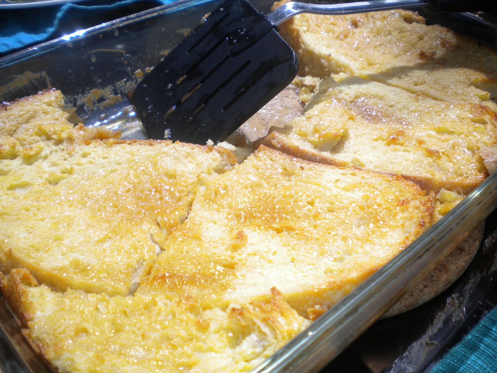 Either cut the bread yourself in 1 " thick slices (discarding the ends) or as mentioned above, use a presliced bread to save time. The goal is to have 1" thick slices, so double up on your bread if you need to. I keep the crusts on for a more chewy texture, but you can trim them if you wish. Arrange the slices in one layer in the pan flat over the sauce, squeezing them in there tightly. In a large bowl, whisk the eggs with the half and half, Grand Marnier, salt, vanilla and spices. Pour evenly over bread. With the back of your spoon, push the bread down in areas so it becomes saturated.