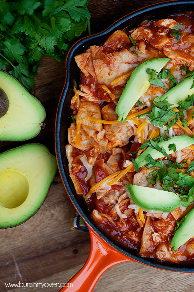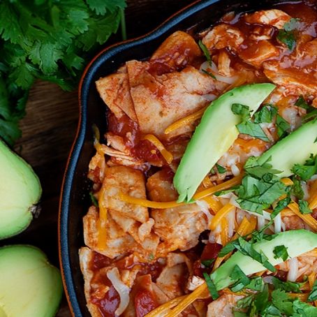 Add corn tortillas to the skillet, and cook, stirring often until golden brown and crisp, about 4 minutes. Stir in diced tomatoes, enchilada sauce, tomato sauce and chicken until well combined and heated through, about 2 minutes. Top with cheeses and cover until melted, about 2 minutes. Edit my recipe