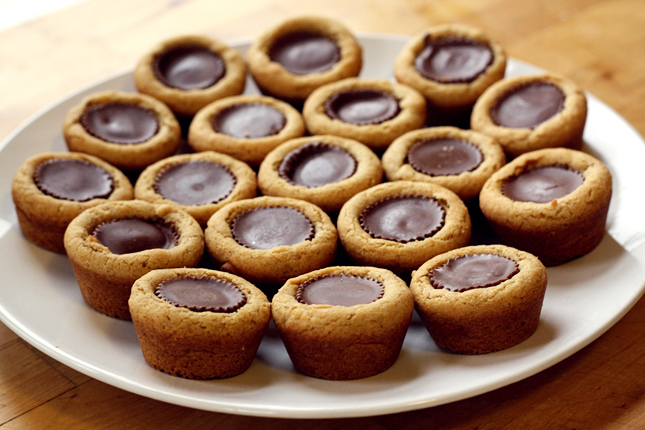 Bake at 375 degrees for about 8 minutes. Remove from oven and immediately press a mini peanut butter cup into each ball. Cool and carefully remove from pan.