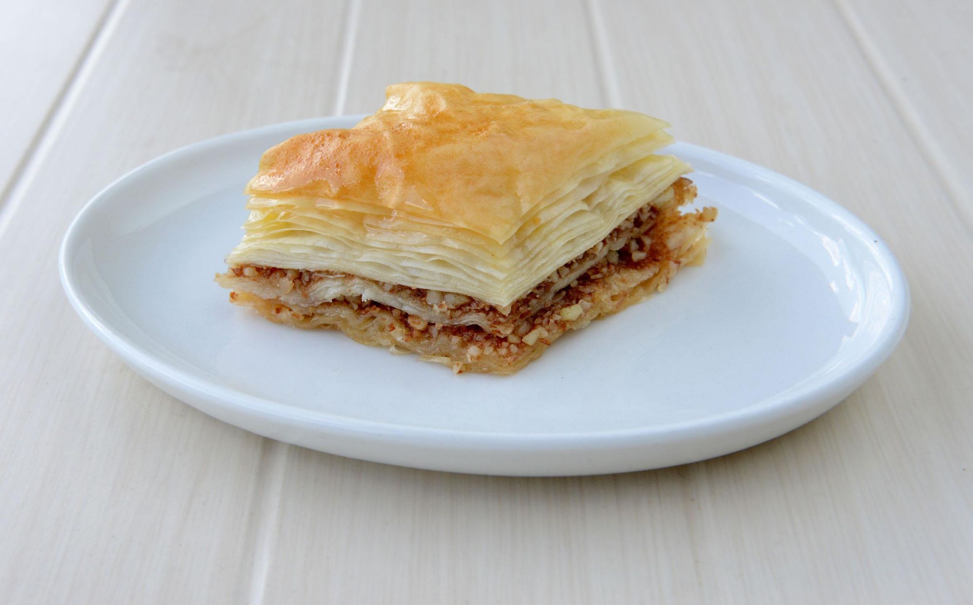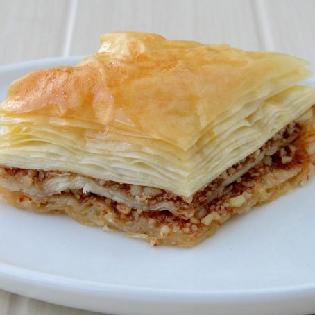 4. Spread walnuts mixture over pastry stack. Place 1 remaining pastry sheet on a flat surface. Brush with butter. Top with 1 pastry sheet. Repeat with remaining butter and pastry sheets (around 22 sheets). Place on walnuts mixture. Cut all the way through into squares. Bake for 50 to 55 minutes or until browned and puffed.