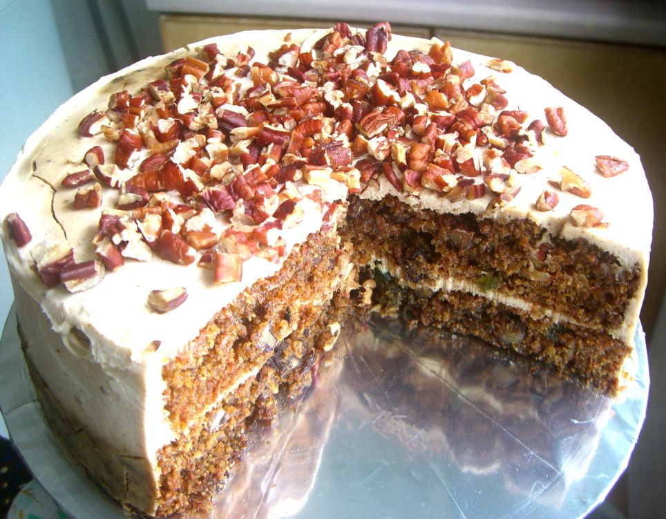 Fold in carrots and chopped nuts until well blended. Distribute batter evenly in to 3 9 inch cake layer pans, which have been generously greased. There will be approximately 1 pound 5 ounces of batter per pan.