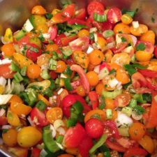 Blend cans of tomatoes, cilantro, jalapenos, garlic, sugar, and lime juice roughly in a food processor. Add green onion and cherry tomatoes to sauce in a bowl. Refrigerate over night to accentuate flavors.