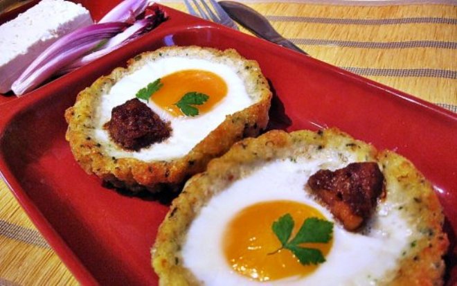 Asezati cartofii in tava, presarati putin cascaval ras in fiecare, apoi cu grija spargeti ouale si turnati-le in cojile de cartofi coapte.