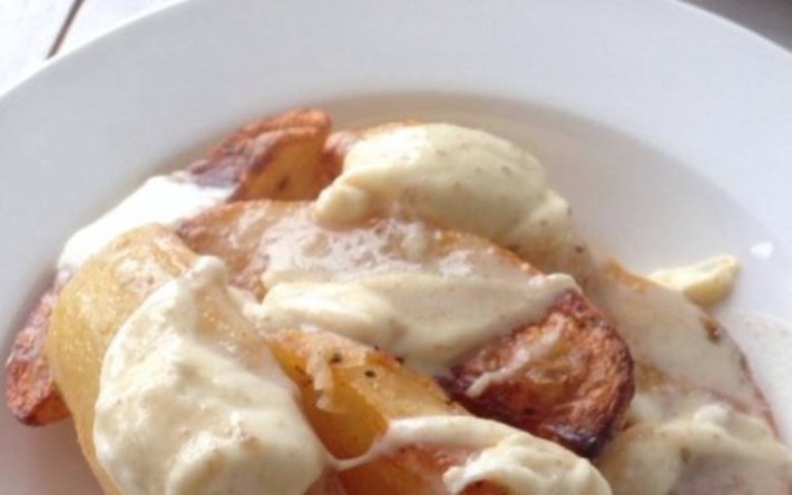 Se a eaz cartofii pe farfurii, se toarn sos din bel ul, apoi fâ ii de mozzarella.