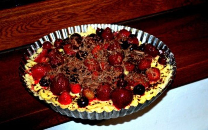 Dupa ce blatul este gata, turnati peste crema cu ajutorul unei spatule, aruncati apoi fructele, iar la final ciocolata rasa. Un desert perfect pentru o zi de duminica!