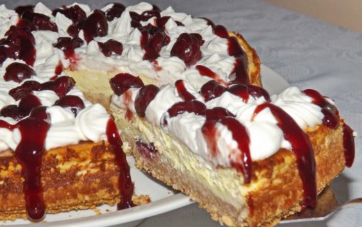 Cu un pos decoram cheescak-ul cu frisca, ciresele ramase si topingul facut mai devreme. Pofta buna!!