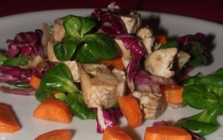 Pieptul de pui il taiem cubulete si adaugam la salata.