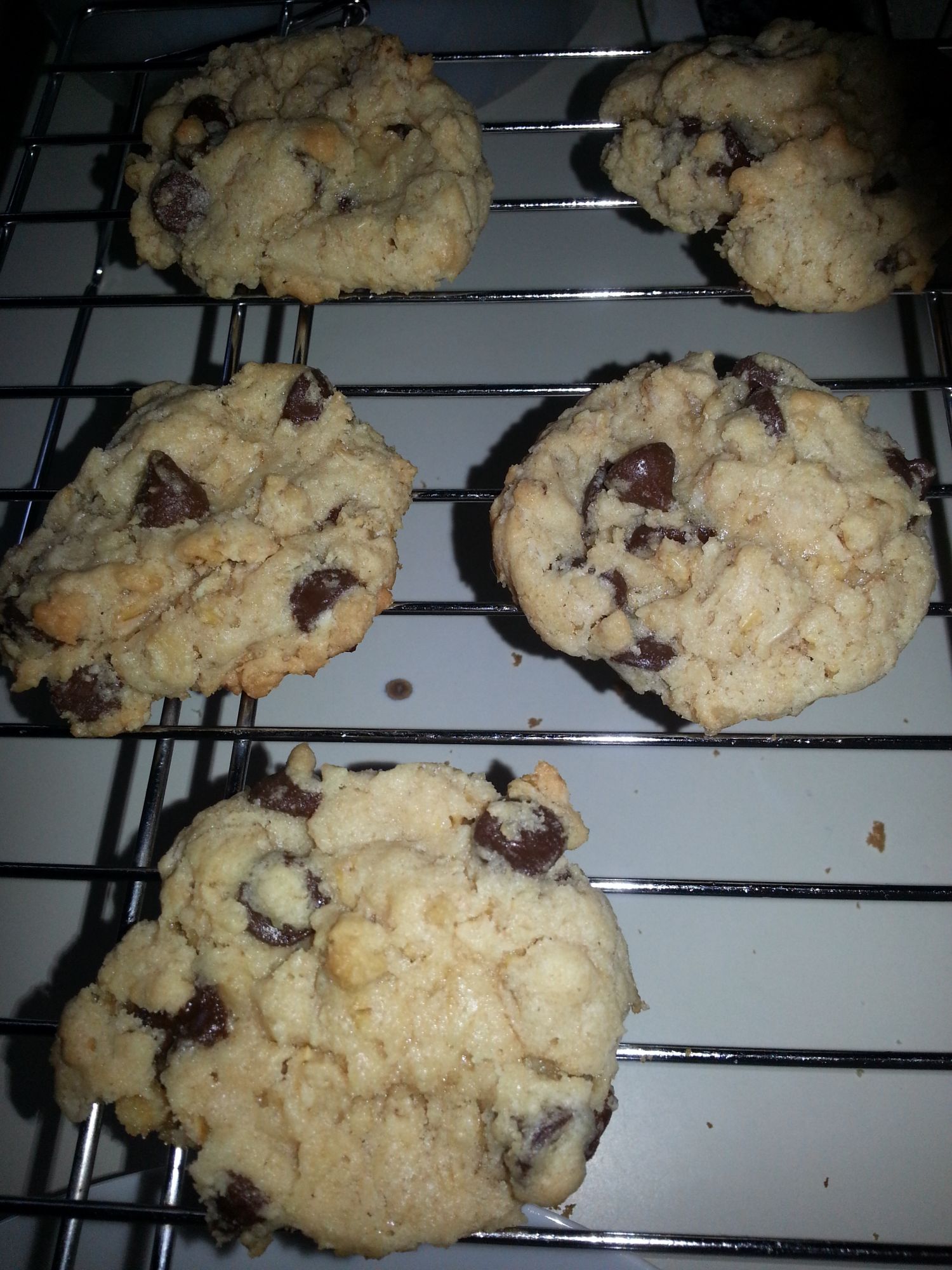 Cream together the oil, Crisco,eggs, and sugars. Add dry ingredients.Fold in chips or raisins.