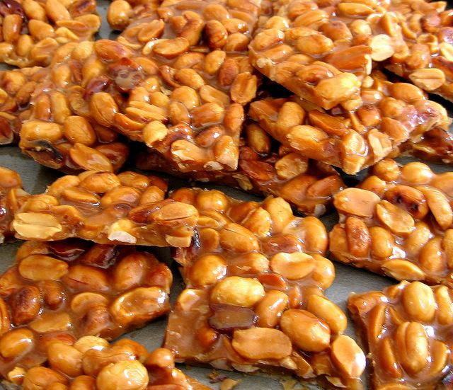 Remove from heat. Working quickly, stir in salt and peanuts, stirring with a wooden spoon. Stir in butter, vanilla and soda.
