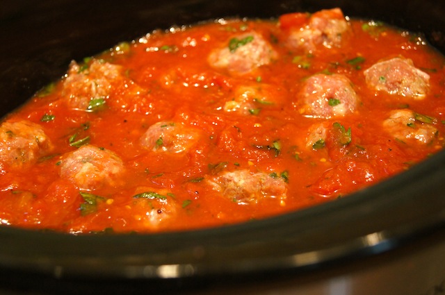In a bowl, combine dry stuffing, beef, egg and broth/water. Mix well. Shape into 1-2 inch balls. Place in slow cooker with sauce. Add any desired chopped veggies. Stir.