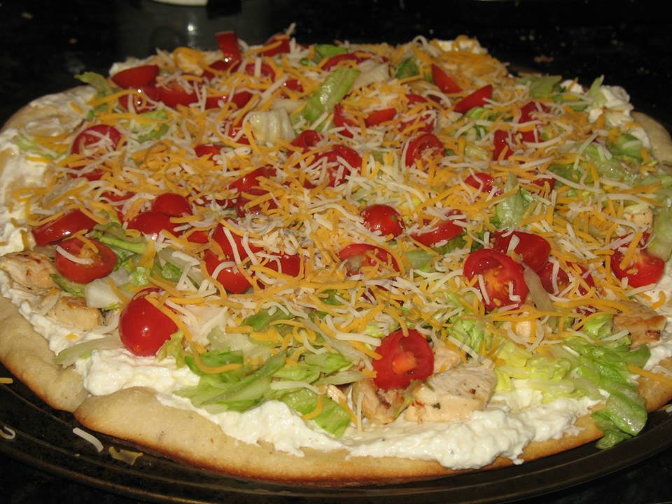 Once your pizza crust has cooled, spread your cream cheese ranch mixture on it. Just a thin layer. Top it with your cooked chicken. Then sprinkle your lettuce, tomato, bacon and cheese. Eat and Enjoy