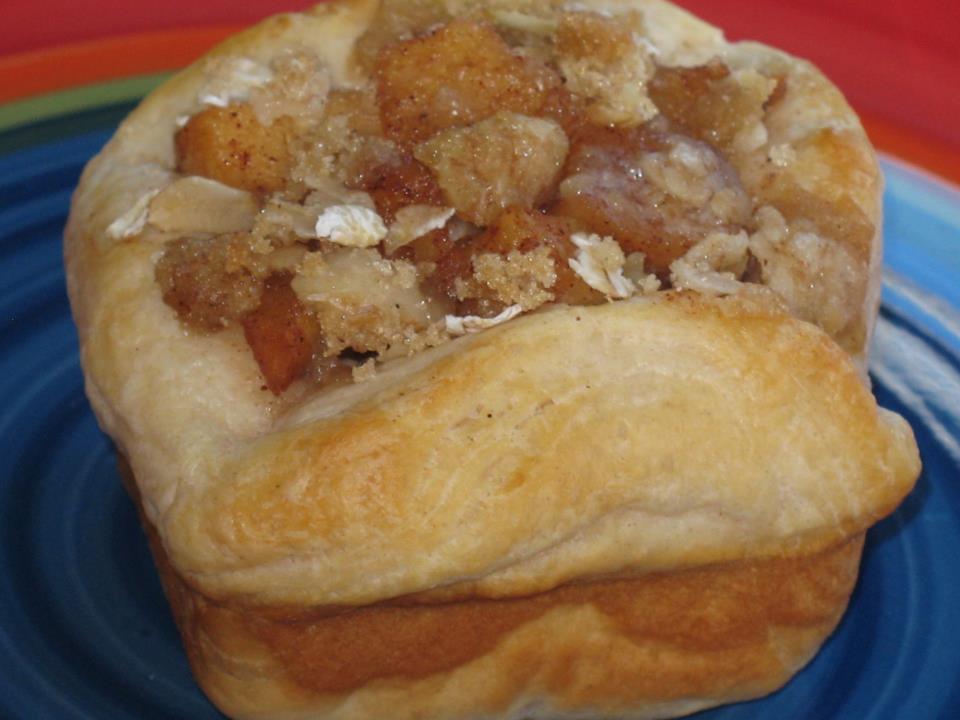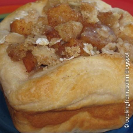 Take your muffin tin or Brownie pan and spray it if need be. Take your biscuit and spread the dough out and put it nicely in the square or round hole. So it makes a cup. Bake at 350 till its almost done. While these are baking take your cut up apples, and add the spices, sugar and water. Cook till they are soft. About 5-10 minutes on low. You want them semi soft but not all the way soft. Take the biscuits out. If its puffed up way to much in the middle you can take a knife and cut a square out of the doughy middle so the apple mix will fit in it. Set it aside. Take your apple mix and put it inside the cup. After that's done make up your topping. Crumple it on top. Bake at 350 till nice and hot and the biscuit is done. Then Enjoy