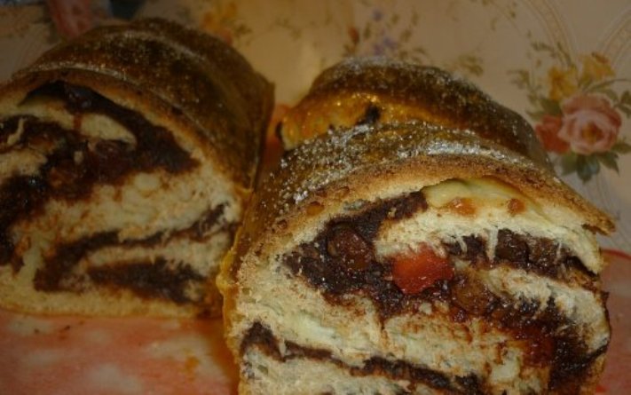 Se amesteca alunele macinate cu zaharul, cacao si albusul de ou batut, apoi se pune laptele fierbinte si se amesteca pana la omogenizare. Se scoate aluatul pe masa pudrata cu faina si se imparte in doua. Se intinde fiecare foaie in forma dreptunghiulara cu grosimea de ~ 0,5 cm si lungimea in functie de forma pe care o aveti.Se pune umplutura din amesteecul cu cacaua pe fiecare foaie, se adauga stafide si rahat si apoi se ruleaza pe lungime.