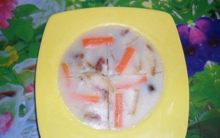 Morcovul fiert din supa il taiem fasii si il asezam in farfurie,mai punem si cateva bucati de carne si sorici.