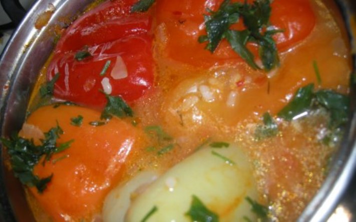 Cu ajutorul unei linguri se umplu ardeii si se pun intr-o cratita.