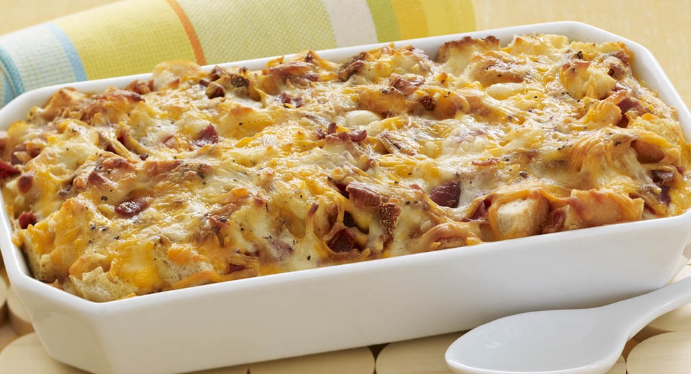 Preheat oven to 350 degrees F. Cook bacon in large skillet until crisp. Reserve 2 tablespoons of the drippings. Drain bacon on paper towels; crumble and set aside. Add onion to drippings in skillet; cook and stir 3 minutes or until softened.