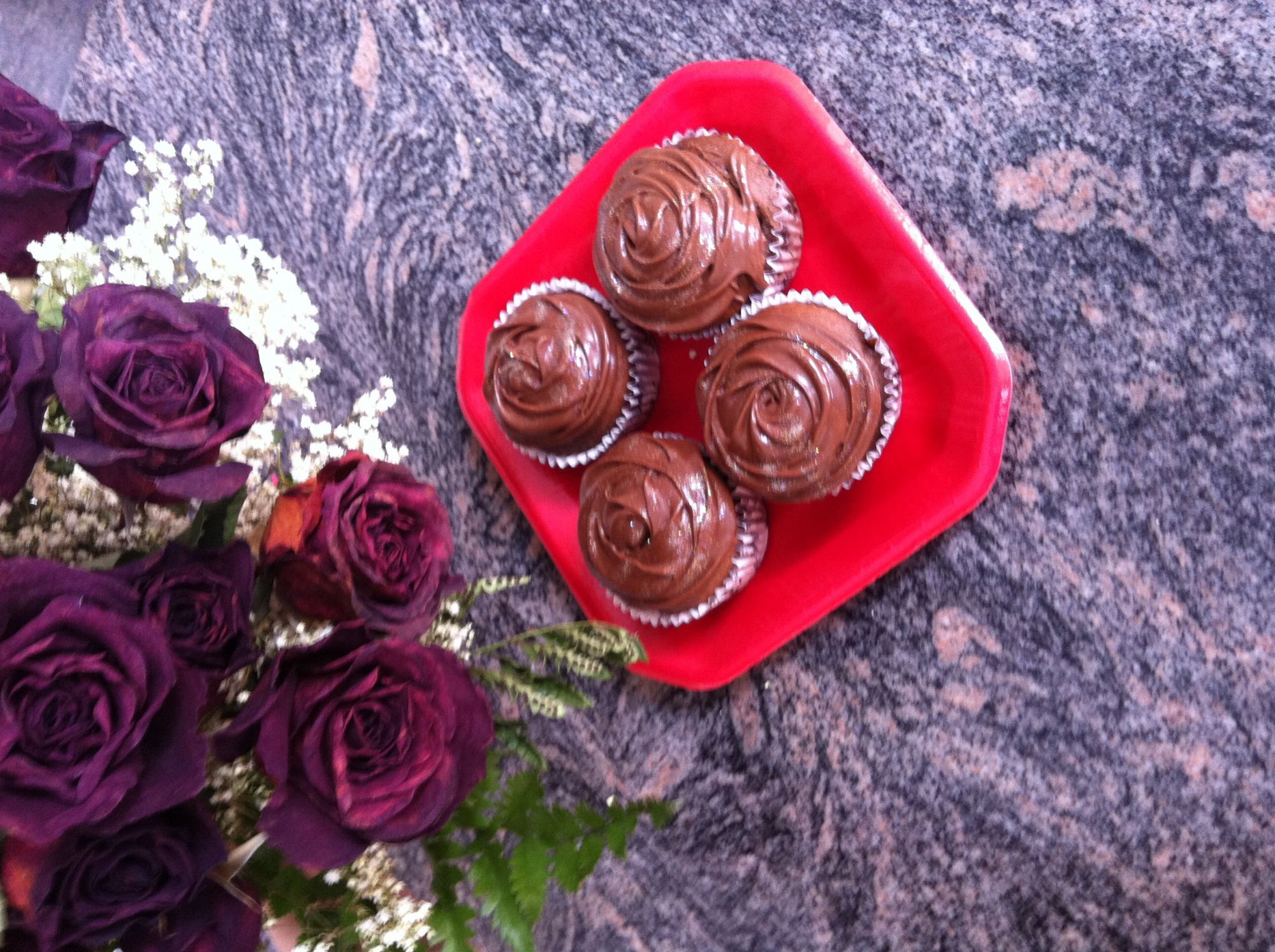 . Place 60ml batter into each cupcake and place a ferrero choc in the centre. Bake in oven for 20-25 minutes till done. Remove from pan and cool on wire rack. Spoon chocolate glaze on to cupcakes. Leave to set and decorate as desired.