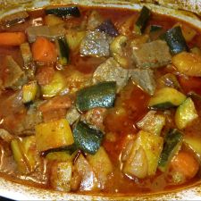 Return the meat and any juices to the pan, tossing to coat with the spices. Add 1 cup beef broth and the tomato, scraping the pan. Simmer for 10 minutes or until thickened. Mix in a large casserole dish with the vegetables, tomato paste and wine.