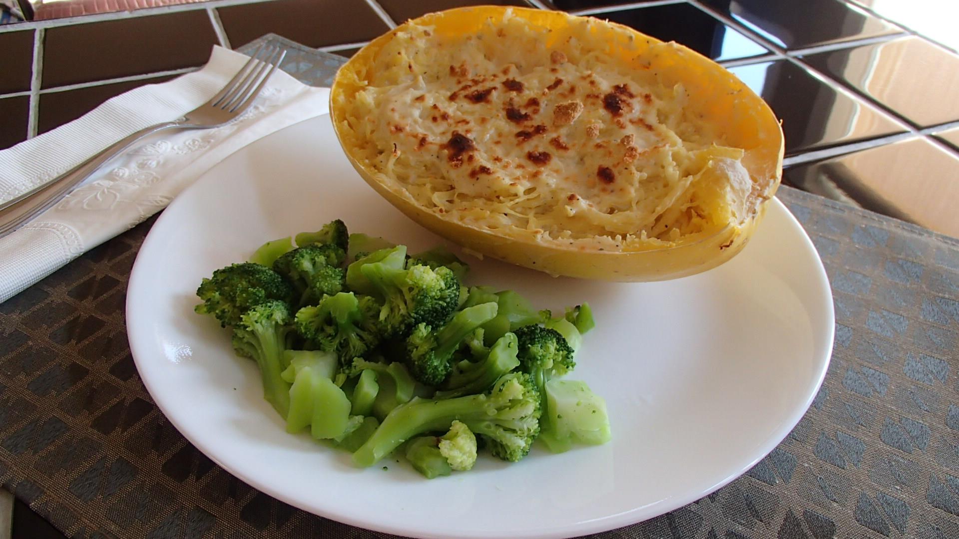 First, prep the squash. Cut spaghetti squash in half using a large sharp knife, scoop out the seeds and place cut side down on a rimmed baking sheet covered with water. Bake until tender, about an hour.